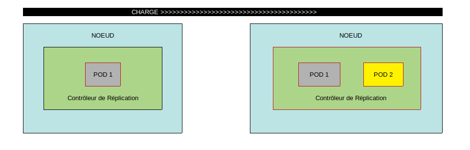 Un Contrôleur de Réplication permet aussi de démarrer de nouveaux PODs en cas d'augmentation de la charge ainsi que d'assurer l'équilibrage de la charge entre les PODs :