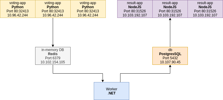 root@debian10:~/myapp# kubectl get services NAME TYPE CLUSTER-IP EXTERNAL-IP PORT(S) AGE db ClusterIP 10.96.30.165 <none> 5432/TCP 4m2s kubernetes ClusterIP 10.96.0.1 <none> 443/TCP 46h redis ClusterIP 10.96.99.190 <none> 6379/TCP 4m2s result-service NodePort 10.96.128.82 <none> 80:31801/TCP 4m1s voting-service NodePort 10.96.73.238 <none> 80:30343/TCP 4m