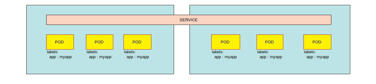 De même, quand les PODs sont distribués sur plusieurs nœuds, le Service s'étend pour tout englober :
