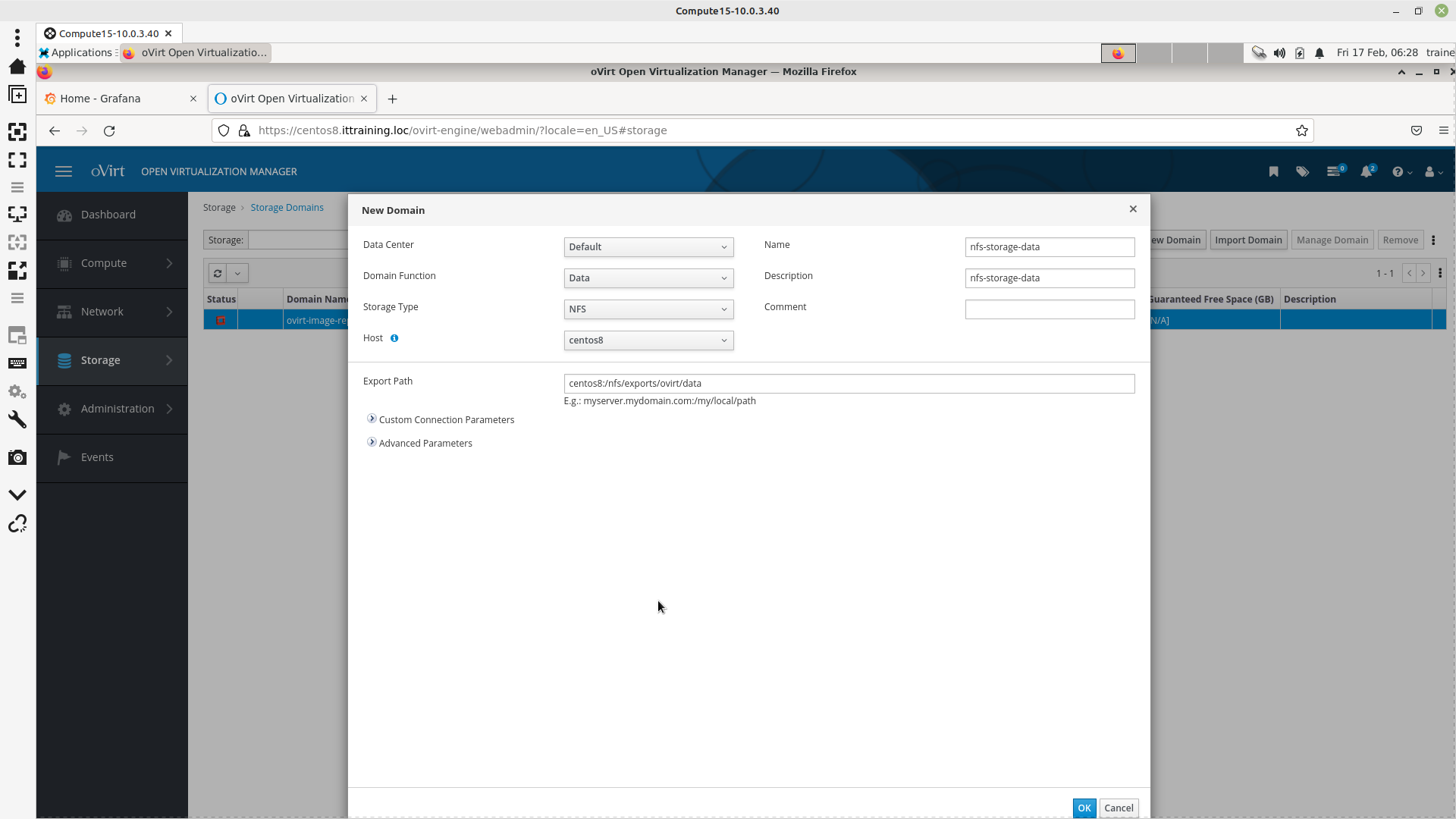 Naviguez à Storage > Domains > New Domain et ajoutez /nfs/exports/ovirt/data :