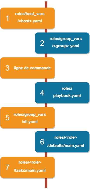 Important : La variable fixée dans playbook.yaml surcharge la variable fixée dans group_vars/all.yaml qui surcharge la variable fixée dans defaults/main.yaml qui surcharge la variable fixée dans tasks/main.yaml.