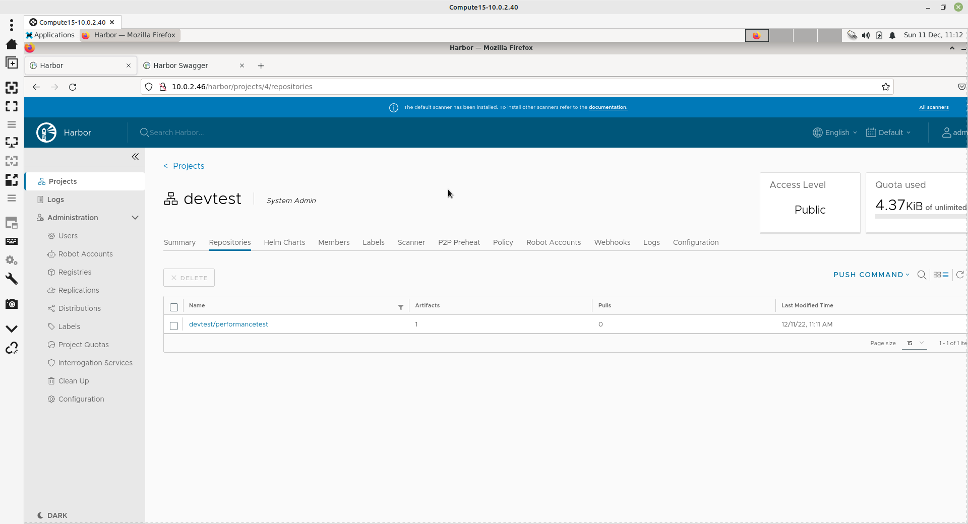 root@debian11:~/harbor# docker ps -a CONTAINER ID IMAGE COMMAND CREATED STATUS PORTS NAMES b8e4e3934c7a goharbor/harbor-jobservice:v2.6.2 "/harbor/entrypoint.…" 15 minutes ago Up 15 minutes (healthy) harbor-jobservice 579b4b43877f goharbor/nginx-photon:v2.6.2 "nginx -g 'daemon of…" 15 minutes ago Up 15 minutes (healthy) 0.0.0.0:80->8080/tcp, :::80->8080/tcp nginx 57c8697b4d39 goharbor/trivy-adapter-photon:v2.6.2 "/home/scanner/entry…" 16 minutes ago Up 15 minutes (healthy) trivy-adapter ce4823c62886 goharbor/harbor-core:v2.6.2 "/harbor/entrypoint.…" 16 minutes ago Up 15 minutes (healthy) harbor-core 57992f8f573a goharbor/chartmuseum-photon:v2.6.2 "./docker-entrypoint…" 16 minutes ago Up 15 minutes (healthy) chartmuseum e2df863f7009 goharbor/harbor-portal:v2.6.2 "nginx -g 'daemon of…" 16 minutes ago Up 15 minutes (healthy) harbor-portal 3e7e2093a4a2 goharbor/harbor-db:v2.6.2 "/docker-entrypoint.…" 16 minutes ago Up 15 minutes (healthy) harbor-db 406aa384c742 goharbor/redis-photon:v2.6.2 "redis-server /etc/r…" 16 minutes ago Up 15 minutes (healthy) redis ddf08dcc8390 goharbor/harbor-registryctl:v2.6.2 "/home/harbor/start.…" 16 minutes ago Up 15 minutes (healthy) registryctl b5cedbab739d goharbor/registry-photon:v2.6.2 "/home/harbor/entryp…" 16 minutes ago Up 15 minutes (healthy) registry 13665ace83fd goharbor/harbor-log:v2.6.2 "/bin/sh -c /usr/loc…" 16 minutes ago Up 15 minutes (healthy) 127.0.0.1:1514->10514/tcp harbor-log
