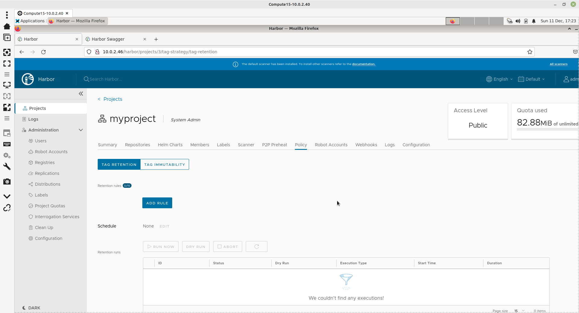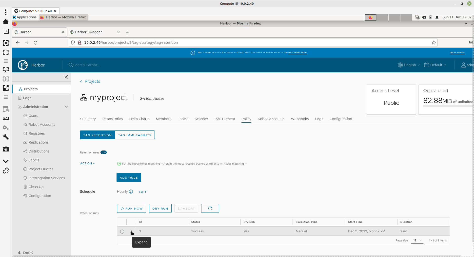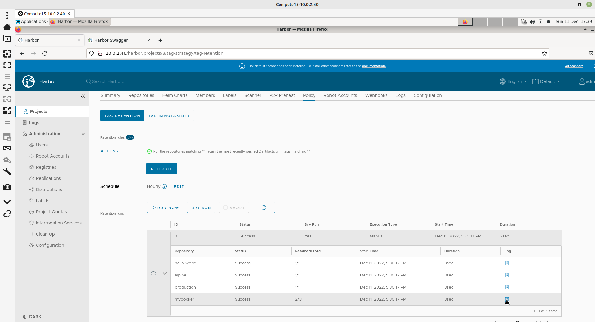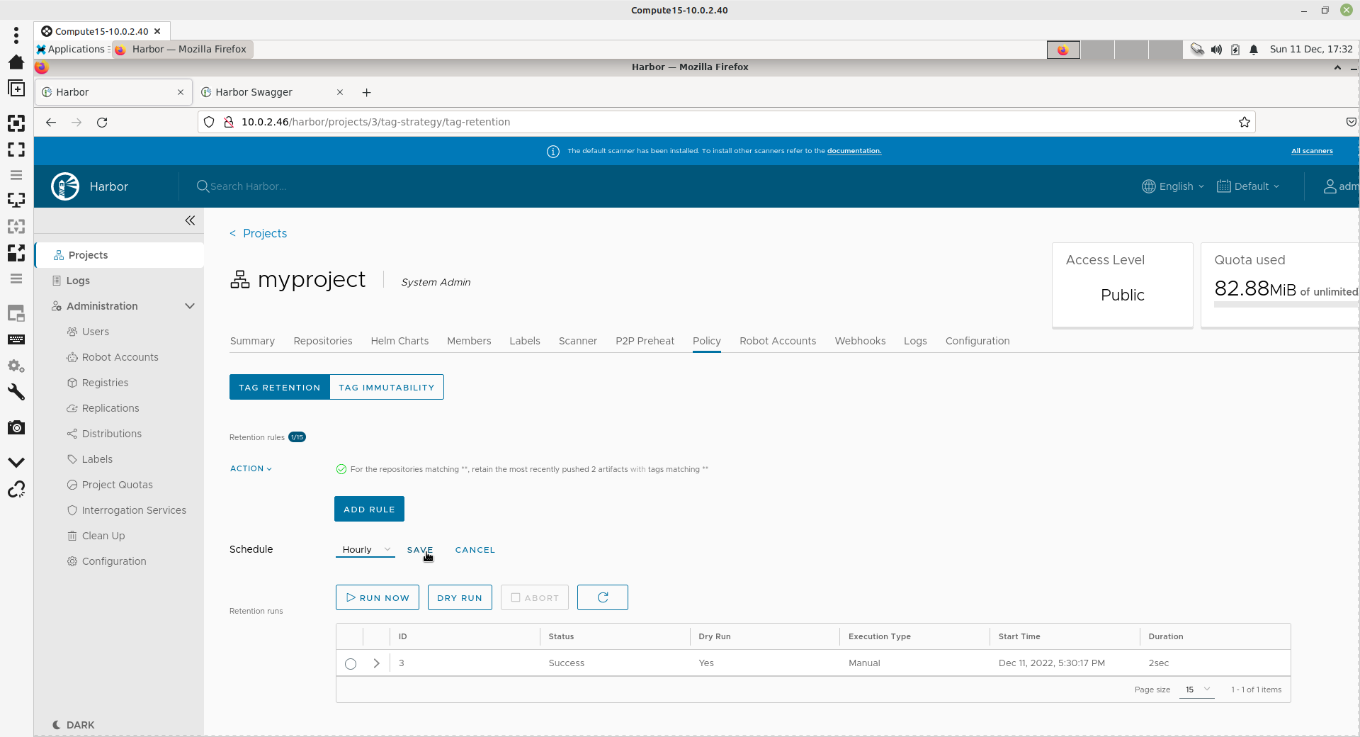 Revenez dans l'interface de Harbor et exécutez la règle en cliquant sur le bouton RUN NOW, puis cliquez sur RUN dans la boîte d'avertissement :