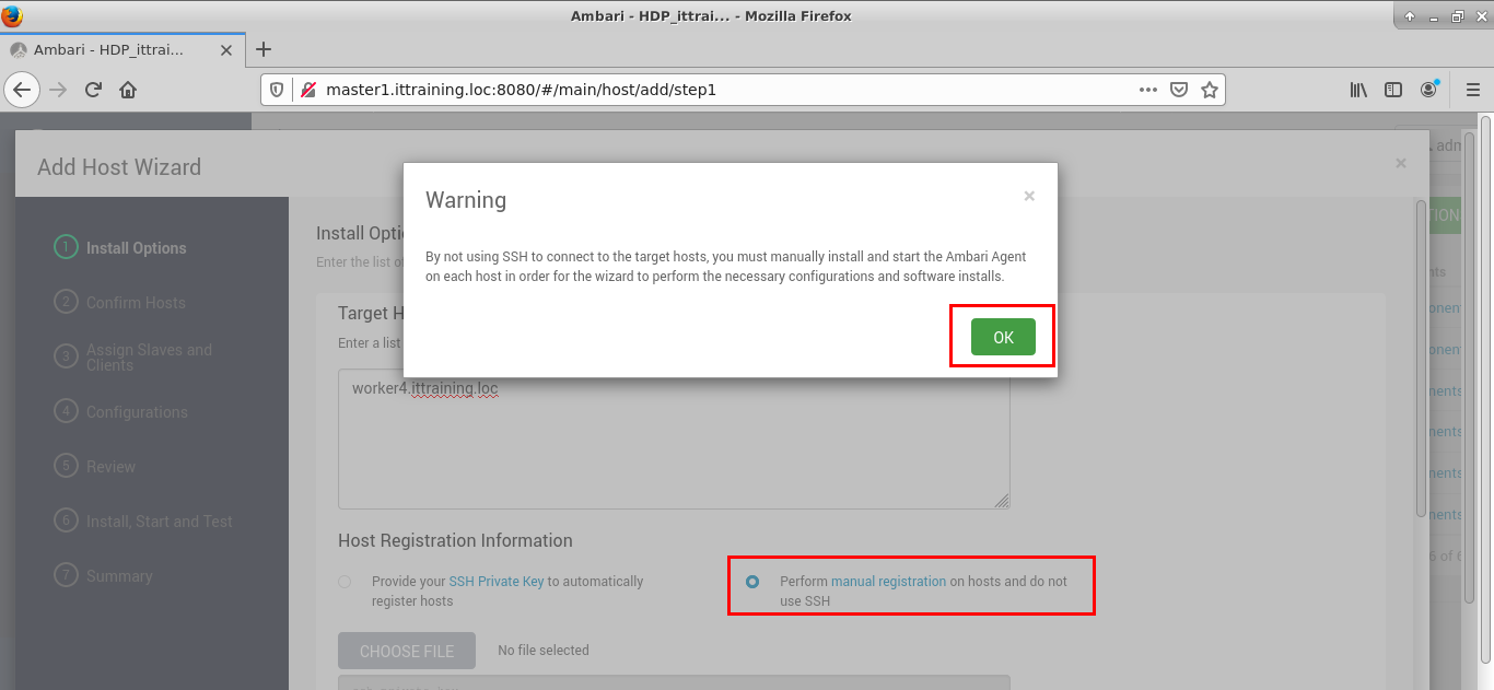 Choisissez l'option Perform manual registration and do not use SSH puis cliquez sur le bouton OK pour valider la boîte d'avertissement :