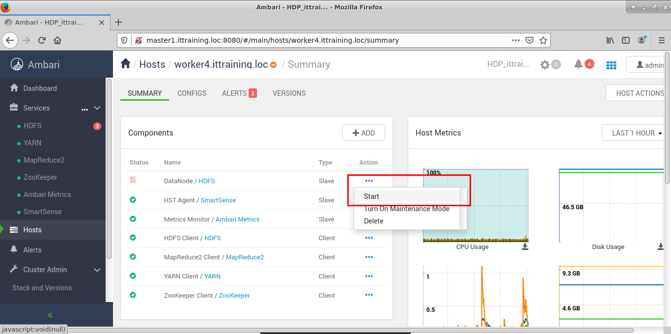 Pour démarrer le service, cliquez sur les trois points horizontaux puis sur Start de la ligne du service DataNode :