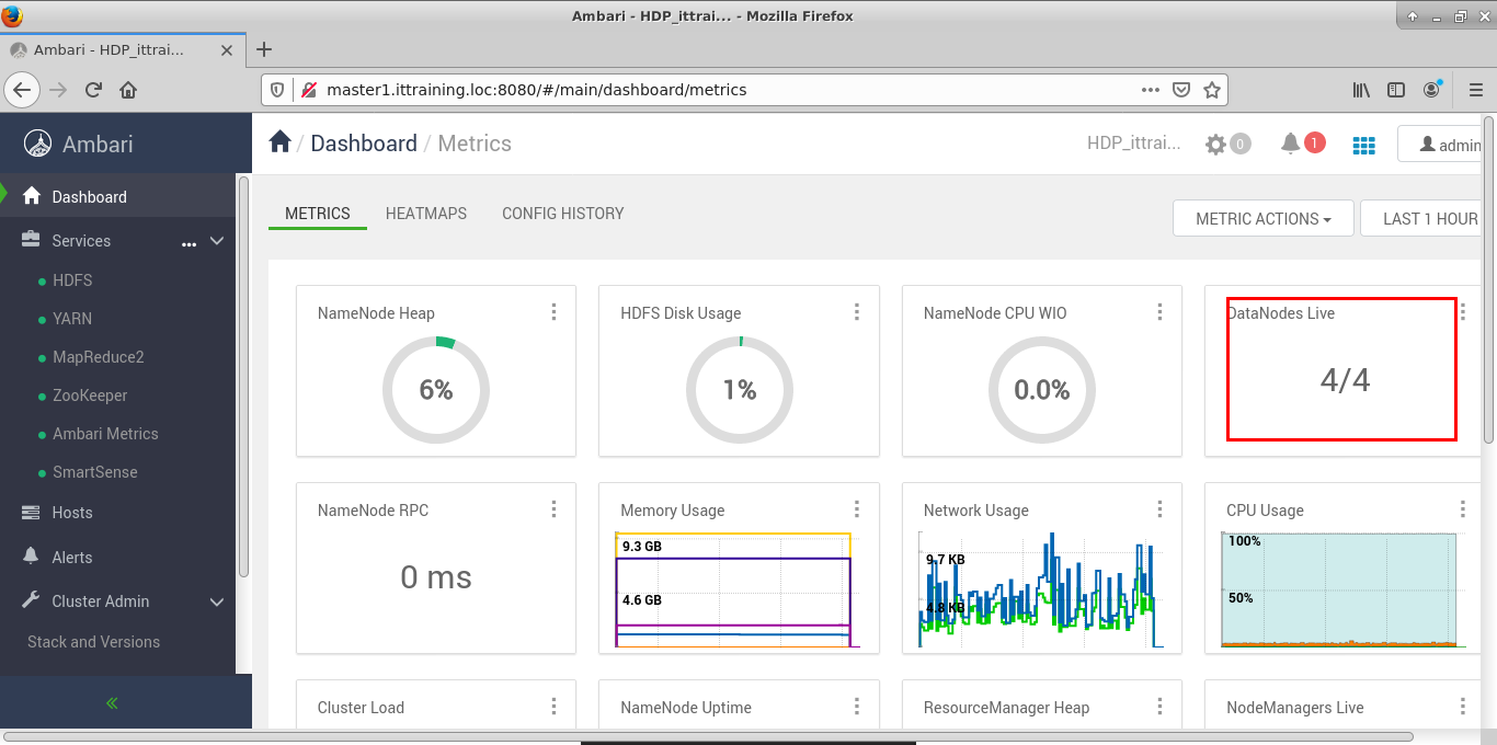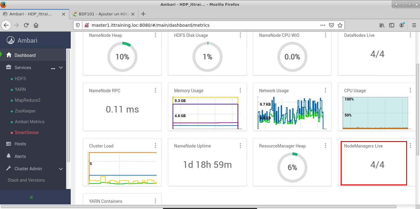 Retournez au Dashboard et notez que le nombre de NodeManagers Live est passé à 4 :
