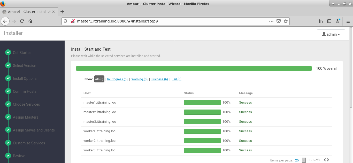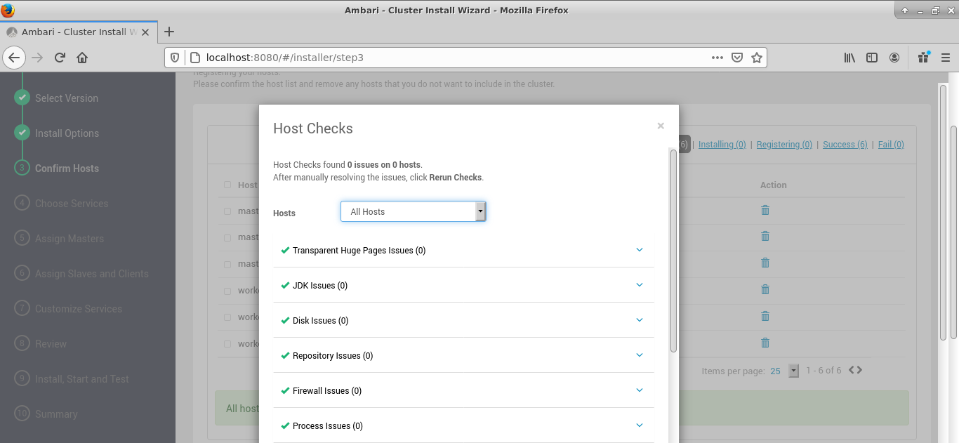 L'assistant initialise chaque noeud du cluster puis vérifie que les pré-requis pour continuer sont satisfaits :