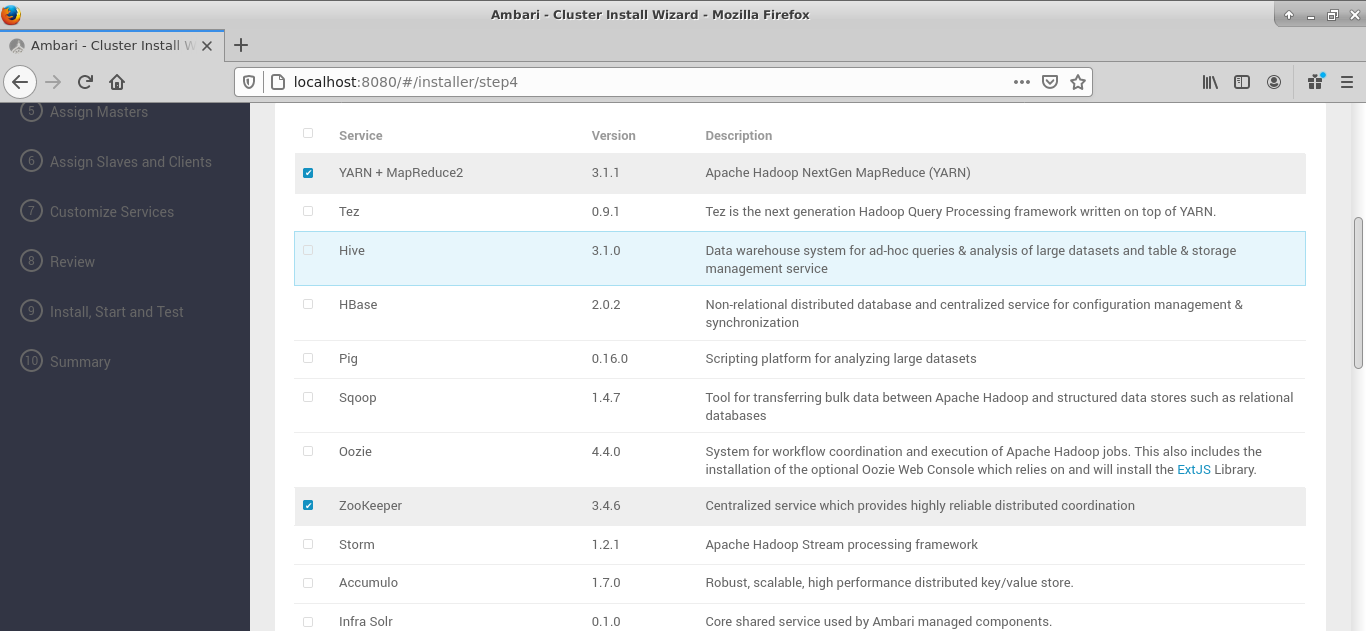 Fermez la fenêtre Host checks et cliquez sur le bouton NEXT. Choisissez maintenant les services que vous souhaitez ajouter. Pour effectuer une installation minimaliste dans un premier temps, ne cochez que HDFS, YARN + MapReduce2 et ZooKeeper puis cliquez sur le bouton NEXT :