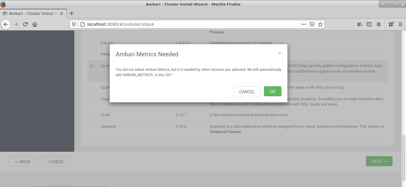 Cliquez sur le bouton OK. L'assistant vous affiche une fenêtre Limited Functionality Warning pour vous avertir des fonctionalités limitées dues au fait qu'Apache Ranger et Apache Atlas n'ont pas été sélectionnés. Cliquez simplement sur le bouton PROCEED ANYWAY chaque fois :