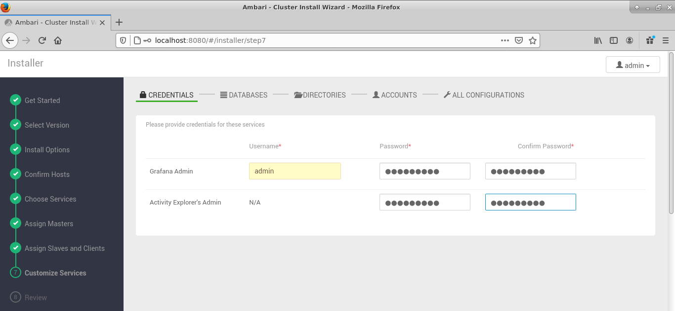 Ensuite l'assistant vous demande de spécifier les mots de passe que souhaitez utiliser pour Grafana et Activity Explorer. Saisissez le mot de passe fenestros dans chaque cas puis cliquez sur le bouton NEXT :