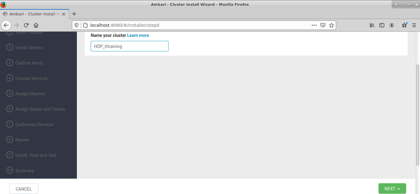 Saisissez le nom HDP_ittraining en tant que CLUSTER NAME et cliquez sur le bouton NEXT :