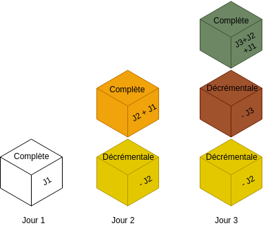 Par exemple pour obtenir un état du système J1 quand on est à J2, il convient de restaurer la sauvegarde complète de J2 qui est en réalité J2+J1 puis la sauvegarde décrémentale -J2. De cette façon et d'une manière mathématique on obtient : J2 + J1 -J2 = J1.