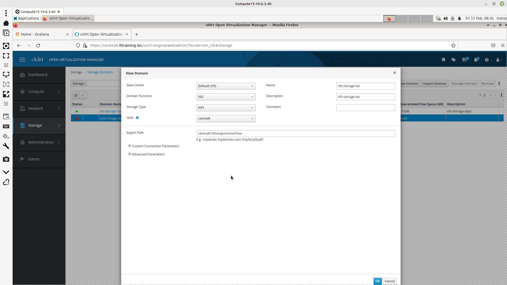 Naviguez à Storage > Domains > New Domain et ajoutez /nfs/exports/ovirt/data :