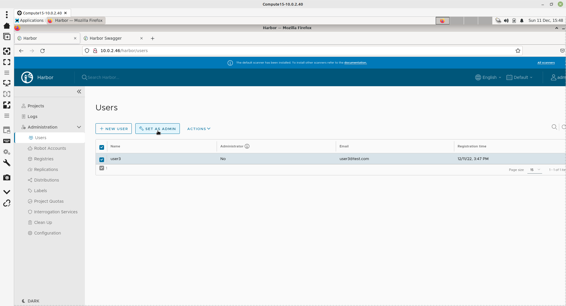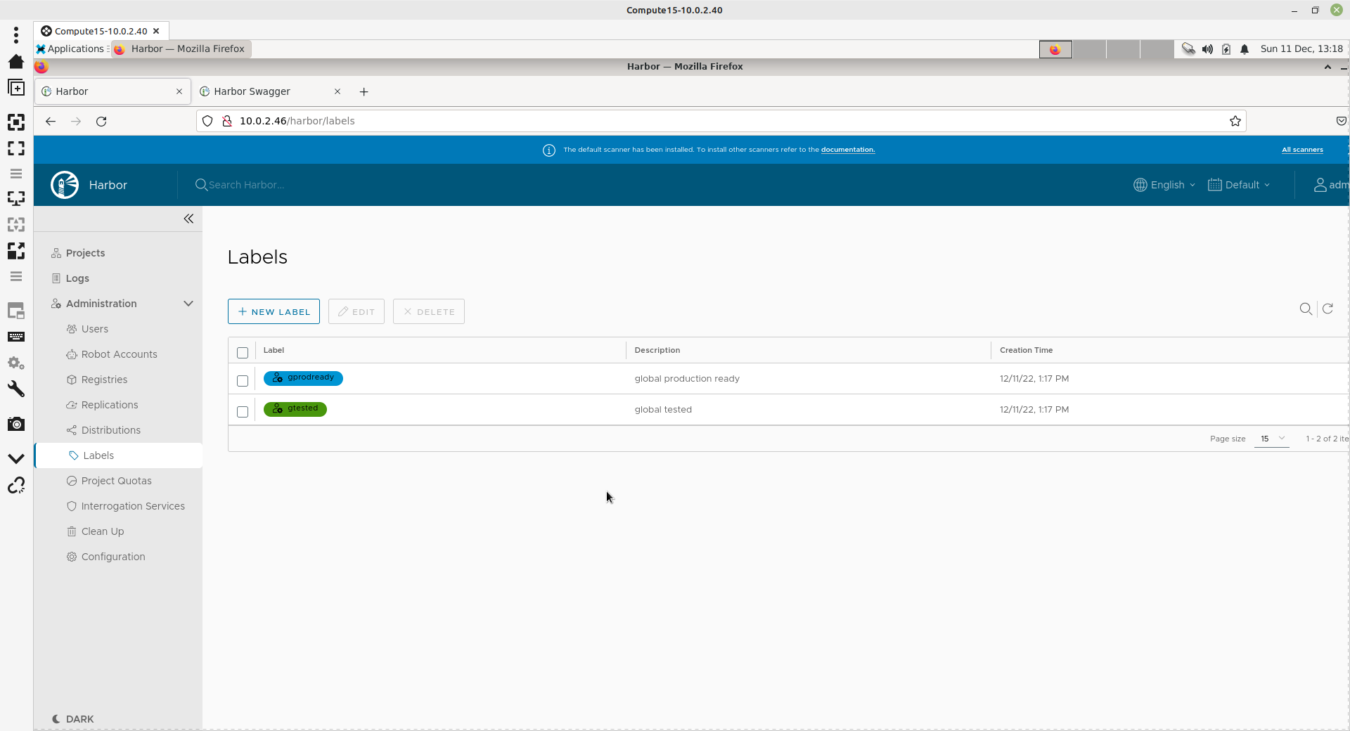 root@debian11:~/harbor# docker ps -a CONTAINER ID IMAGE COMMAND CREATED STATUS PORTS NAMES b8e4e3934c7a goharbor/harbor-jobservice:v2.6.2 "/harbor/entrypoint.…" 15 minutes ago Up 15 minutes (healthy) harbor-jobservice 579b4b43877f goharbor/nginx-photon:v2.6.2 "nginx -g 'daemon of…" 15 minutes ago Up 15 minutes (healthy) 0.0.0.0:80->8080/tcp, :::80->8080/tcp nginx 57c8697b4d39 goharbor/trivy-adapter-photon:v2.6.2 "/home/scanner/entry…" 16 minutes ago Up 15 minutes (healthy) trivy-adapter ce4823c62886 goharbor/harbor-core:v2.6.2 "/harbor/entrypoint.…" 16 minutes ago Up 15 minutes (healthy) harbor-core 57992f8f573a goharbor/chartmuseum-photon:v2.6.2 "./docker-entrypoint…" 16 minutes ago Up 15 minutes (healthy) chartmuseum e2df863f7009 goharbor/harbor-portal:v2.6.2 "nginx -g 'daemon of…" 16 minutes ago Up 15 minutes (healthy) harbor-portal 3e7e2093a4a2 goharbor/harbor-db:v2.6.2 "/docker-entrypoint.…" 16 minutes ago Up 15 minutes (healthy) harbor-db 406aa384c742 goharbor/redis-photon:v2.6.2 "redis-server /etc/r…" 16 minutes ago Up 15 minutes (healthy) redis ddf08dcc8390 goharbor/harbor-registryctl:v2.6.2 "/home/harbor/start.…" 16 minutes ago Up 15 minutes (healthy) registryctl b5cedbab739d goharbor/registry-photon:v2.6.2 "/home/harbor/entryp…" 16 minutes ago Up 15 minutes (healthy) registry 13665ace83fd goharbor/harbor-log:v2.6.2 "/bin/sh -c /usr/loc…" 16 minutes ago Up 15 minutes (healthy) 127.0.0.1:1514->10514/tcp harbor-log