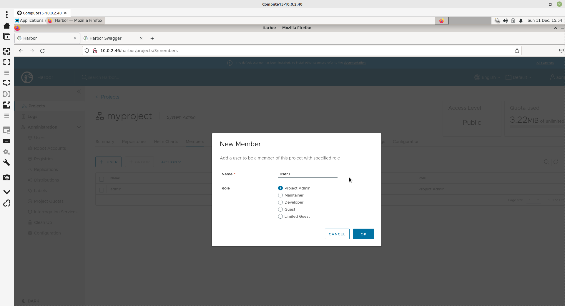Cliquez sur Projects > myproject puis sur Members et + USER :