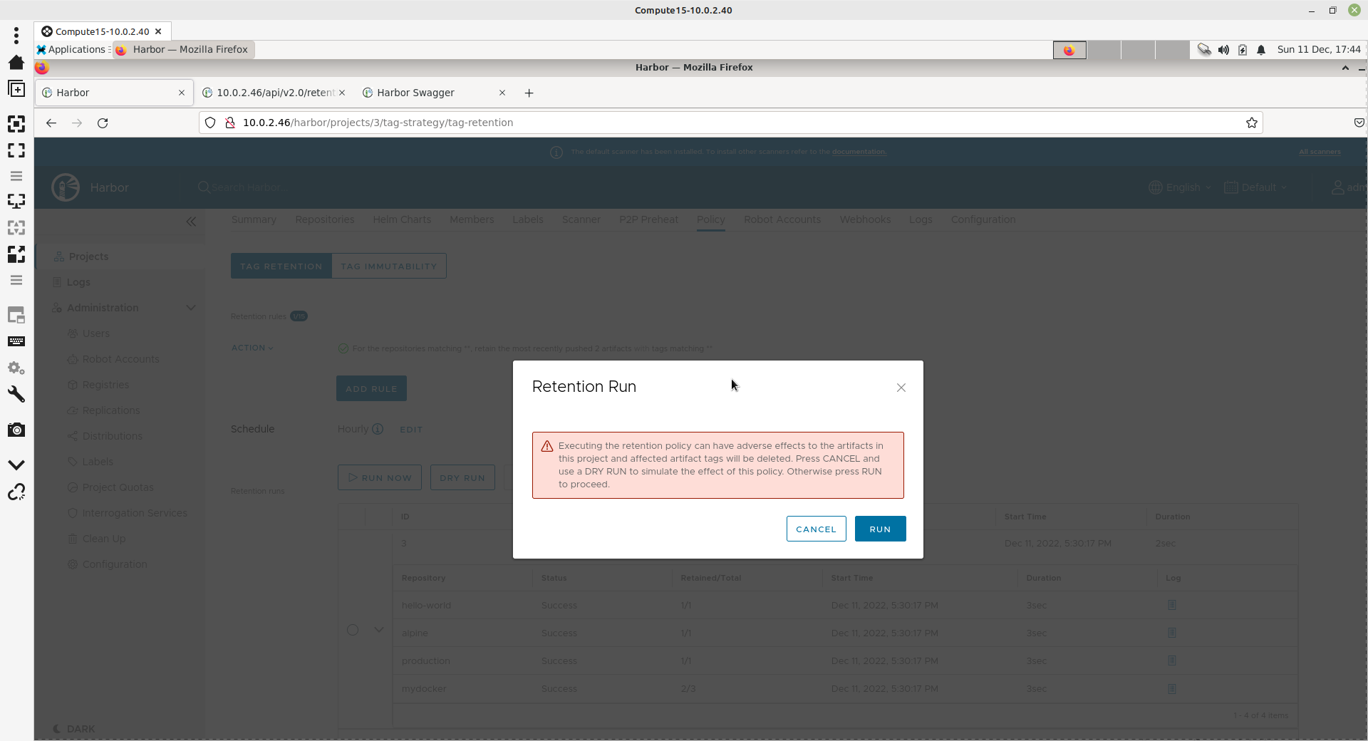 Revenez dans l'interface de Harbor et exécutez la règle en cliquant sur le bouton RUN NOW, puis cliquez sur RUN dans la boîte d'avertissement :
