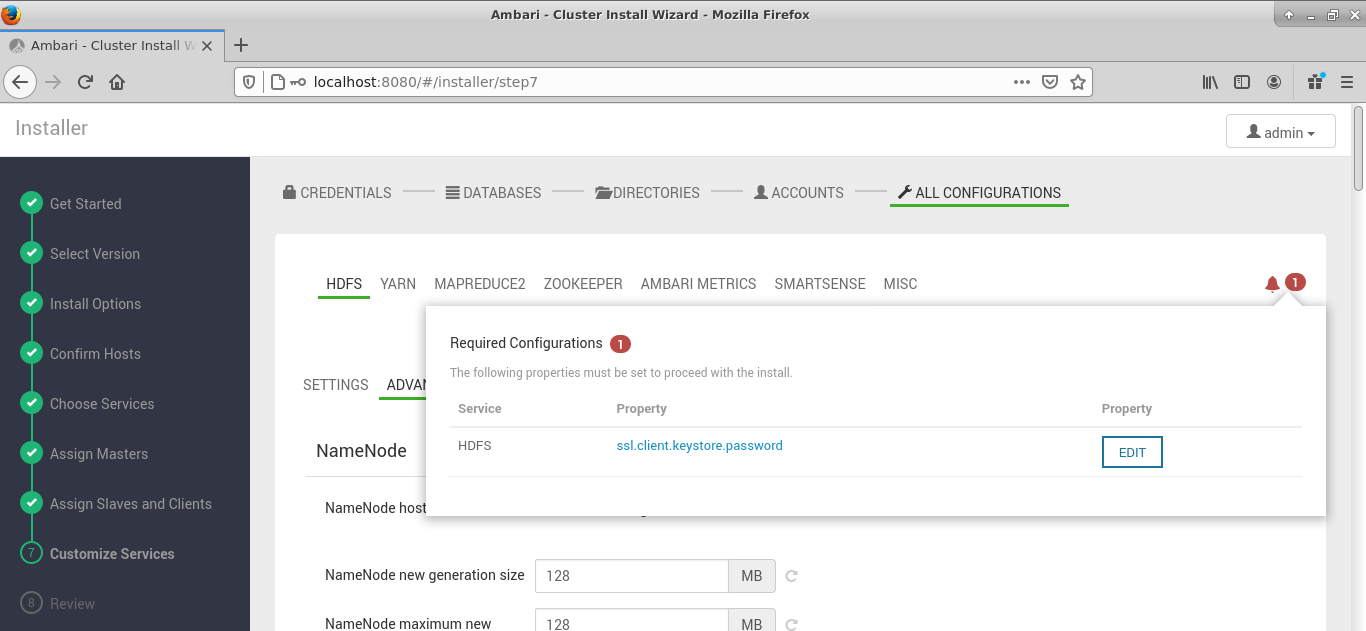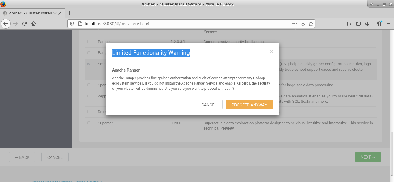 Cliquez sur le bouton OK. L'assistant vous affiche une fenêtre Limited Functionality Warning pour vous avertir des fonctionalités limitées dues au fait qu'Apache Ranger et Apache Atlas n'ont pas été sélectionnés. Cliquez simplement sur le bouton PROCEED ANYWAY chaque fois :