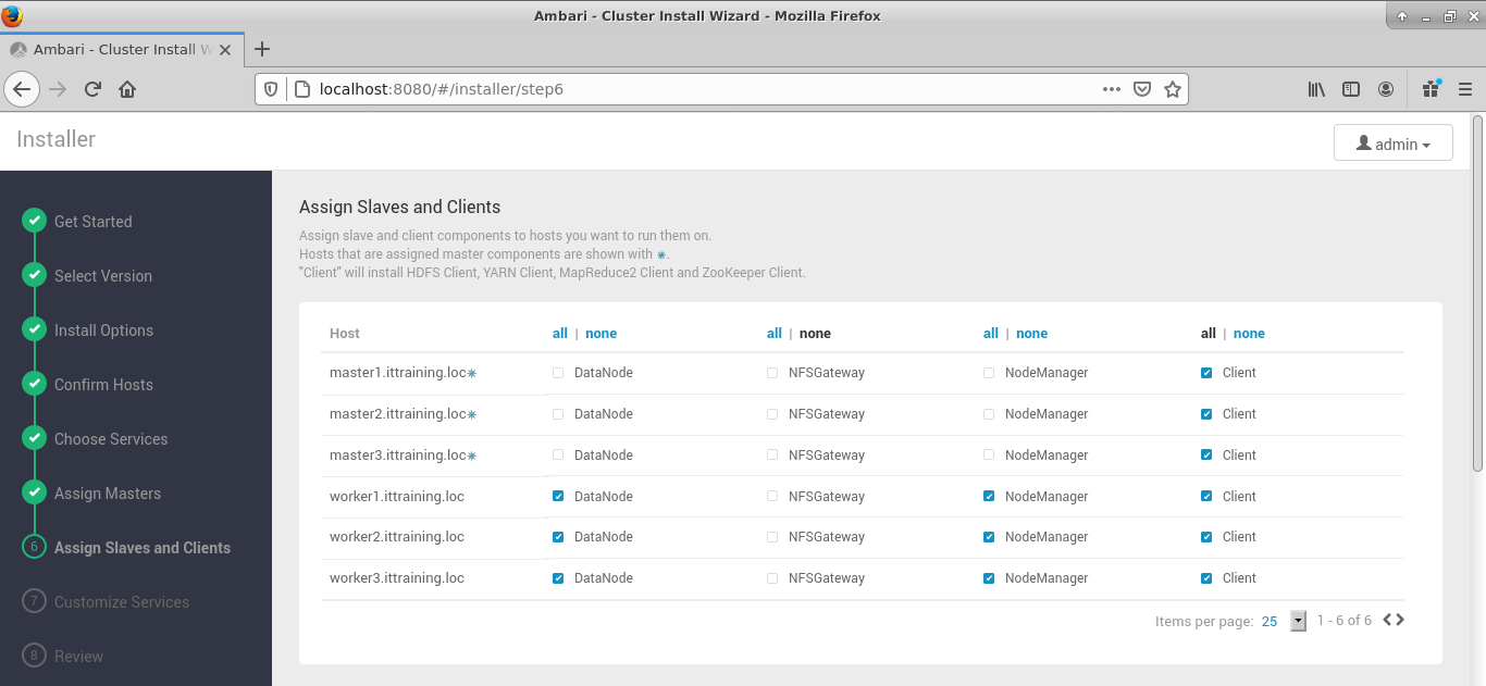 L'assistant vous propose maintenant d'assigner des composants à chaque hôte. Les hôtes ayant des composants maître sont marqués avec une étoile. Cochez Client pour chaque hôte puis cliquez sur le bouton NEXT :