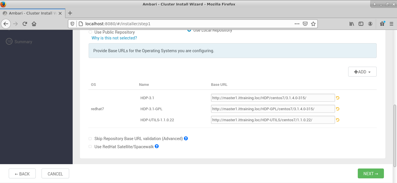 [root@master1 ~]# cat repositories http://master1.ittraining.loc/HDP/centos7/3.1.4.0-315/ http://master1.ittraining.loc/HDP-GPL/centos7/3.1.4.0-315/ http://master1.ittraining.loc/HDP-UTILS/centos7/1.1.0.22/ http://master1.ittraining.loc/ambari/centos7/2.7.4.0-118
