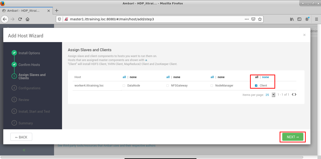 L'assistant vous propose maintenant d'assigner des composants à l'hôte. Cochez Client pour l'hôte puis cliquez sur le bouton NEXT :